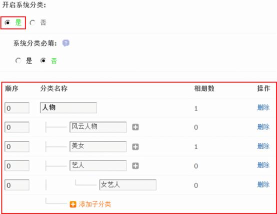 系统分类必填:选择“是”创建相册的时候,必须选择一个系统分类才可以。