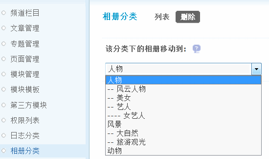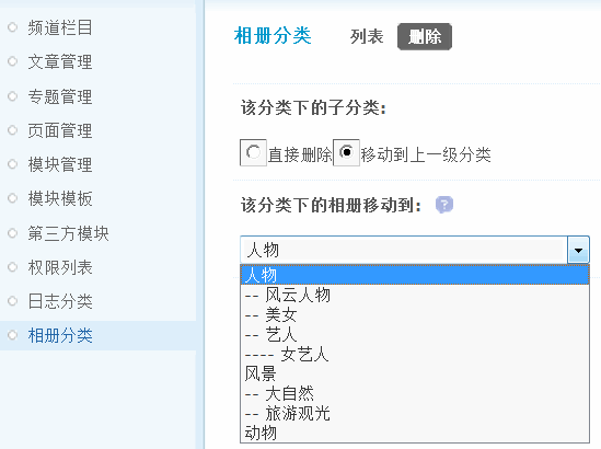当对某一系统相册分类进行删除时,可以选择将此分类下的相册移动到其他相册分类中。如果该分类下存在子分类,还需要处理子分类,可以选择把子分类直接删除或是移动到上一级分类。