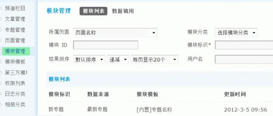 模块管理功能可以对各个模块模板的属性、数据进行定义,增加或者减少用户对模块的管理权限,DIY 站点的时候,可以增加各类想调用的模块。
