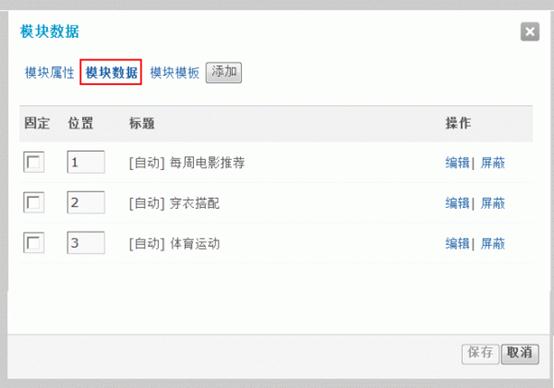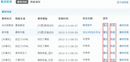 可以点击模块后面的属性和数据链接来修改模块的属性和数据,如下图所示: