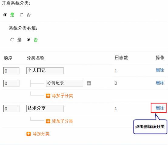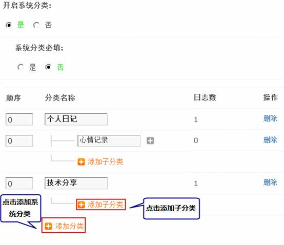 开启系统分类:选择“是”将开启系统日志分类功能,选择“否”则不开启日志分类,会员发表日志的时候只有个人分类,个人分类需要会员自己增加。