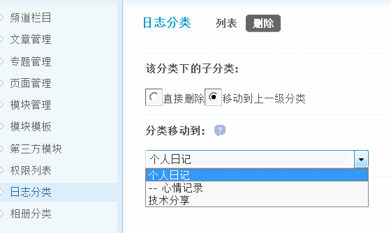 上图说明该分类下有日志,可以选择将此分类下的日志移动到其他日志分类中,然后提交即可。