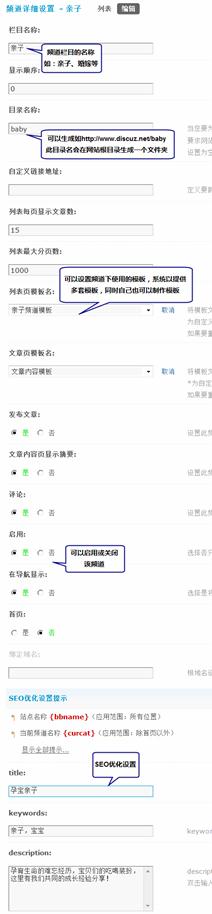 点击相应的链接后,分别可以查看频道、编辑该频道的设置如更改模板名、目录名称等,
