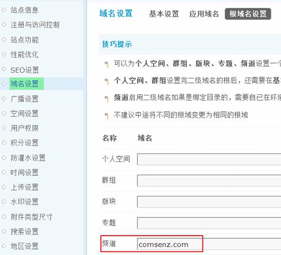 设置频道的根域名,设置好此处的域名后就可以在频道处设置二级域名,如下图所示