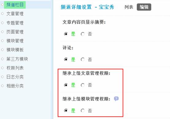 继承上级模块管理权限:选择“是”继承上级模块管理权限,包括页面DIY权限和模块管理权限。