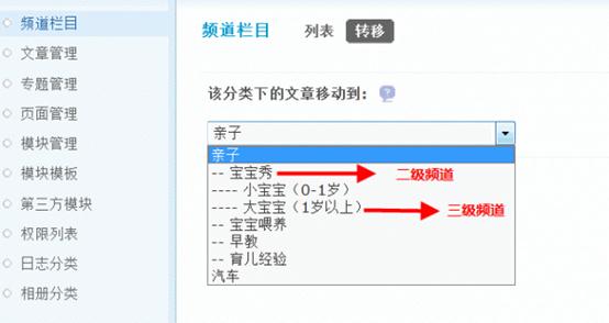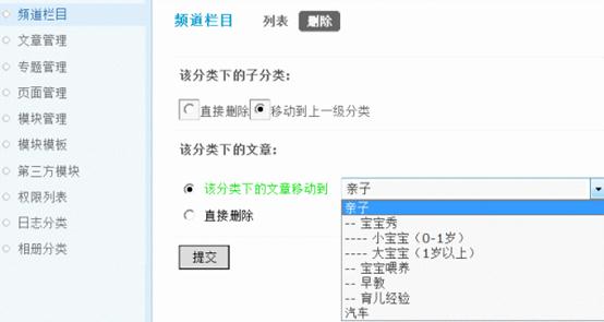 点击根频道栏目右边的删除链接可以直接删除该频道或者选择将该频道下的分类直接删除或者移动到上一级分类。该分类下的文章也可以直接删除或者移动到其它分类下。