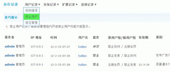 禁止用户记录,需要在管理组内开启禁止用户功能才能显示。