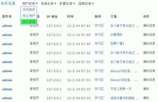 记录用户执行的或被执行的一些操作,包括:忘记密码、禁止用户、版主管理。