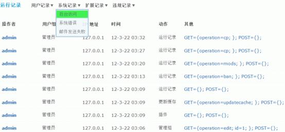 后台访问记录着管理组的成员户访问后台的记录。无论访问后台那个动作,都会有记录,对论坛的修改进行了提交后,在其他那个选项就会出现一些特殊的字符,就是 sql 的片段。所以这个记录很重要,可以了解到访问后台的管理组的人员,到底执行了什么操作。可以通过页面右下角的搜索您需要的后台访问信息。