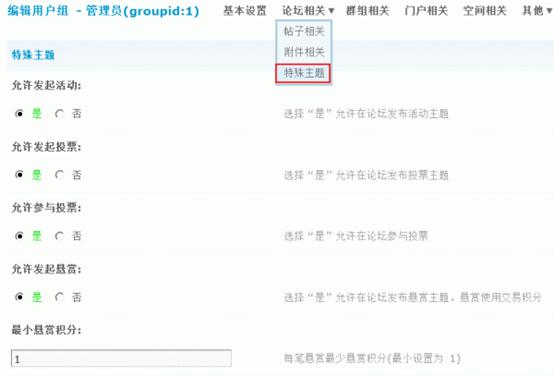 4)允许发起悬赏:选择“是”允许在论坛发布悬赏主题,悬赏使用交易积分。