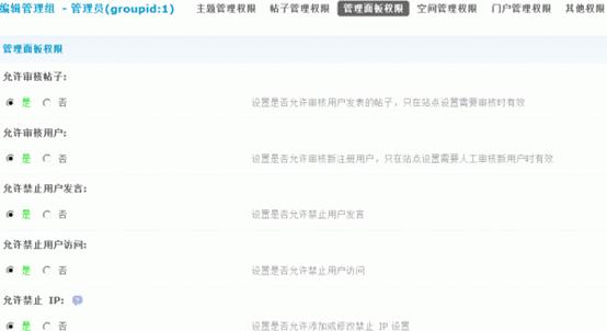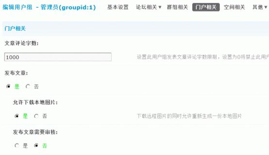 1)允许管理所有文章:是否允许管理门户文章。选择“是”则允许此管理组成员管理编辑删除所有频道栏目文章,
