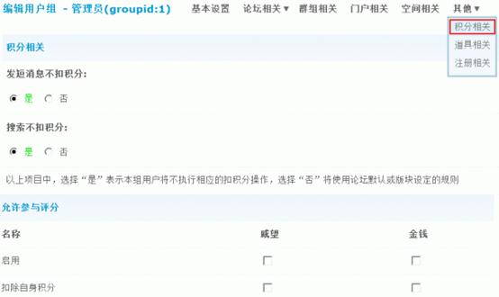 3)允许参与评分:允许该管理组用户在给其他用户评分的时候可以评哪种积分,以及可以评分的最大值与最小值,和24小时评分总量。
