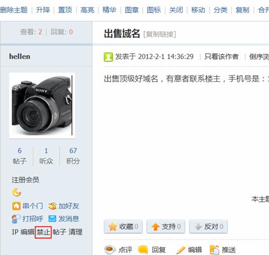 在浏览帖子页面时,如果发现某个会员发布违规信息,有禁止用户权限的管理人员可以点击会员名下面的管理选项,然后点击“禁止”。如下图所示:
