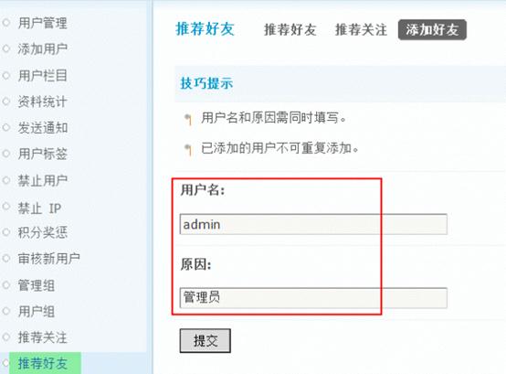 操作路径:【后台】=>【用户】=>【推荐好友】点击“添加好友”,用户名和原因需同时填写。