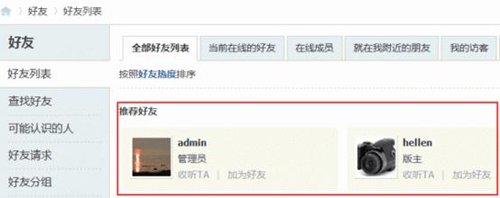 站长可以通过推荐好友功能,将指定会员推荐给新注册会员,让新注册会员选择添加站长推荐的好友。该功能可以增加新手会员与网站管理层的接触,提高网站的互动性。