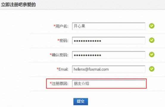 选择“人工审核”,保存,新用户注册时,需要输入注册原因,如图: