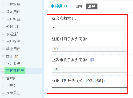 上次审核于多少天前:删除上次审核于多少天前的用户。