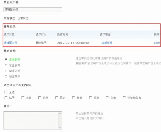 禁止用户的同时可以清空该用户的相关内容,包括帖子、点评、记录、日志、相册、分享、头像、评论和留言。