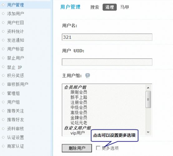 1、管理用户(编辑会员的资料、用户组、权限、积分,授予会员勋章,查找马甲、禁止用户以及删除会员等);
