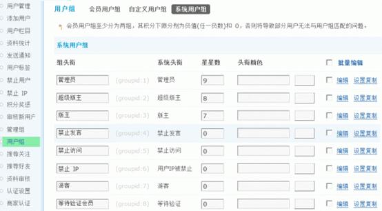 在这里,可以修改几个默认的系统用户组的名称与星星数目等,同样,点击“编辑”可以看到用户组的具体设置。