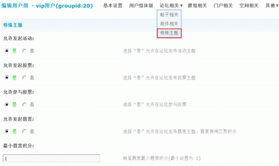 4)允许发起悬赏:选择“是”允许在论坛发布悬赏主题,悬赏使用交易积分。