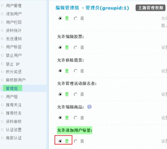 操作路径:【后台】=>【用户】=>【管理组】=>【管理权限】=>主题管理权限中可以设置是否“允许添加用户标签”这里选择“是”如下图所示: