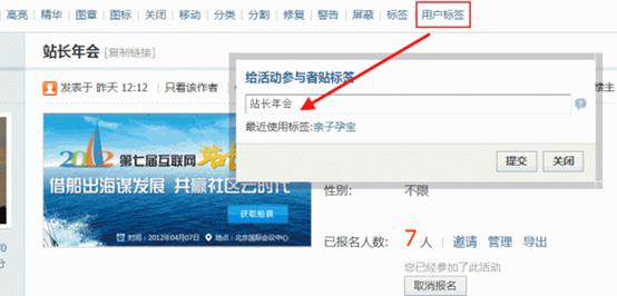 在活动帖子中,点击帖子内容上方的“用户标签”即可为参加该活动的所有用户批量添加一个或多个标签。