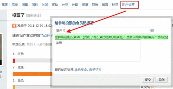 在投票帖子中,点击帖子内容上方的“用户标签”即可为参加该投票的所有用户批量添加一个或多个标签。