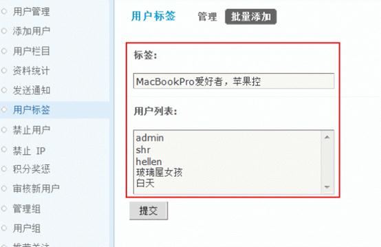 4、后台添加用户标签项,可以单独管理,也可以批量添加用户标签;