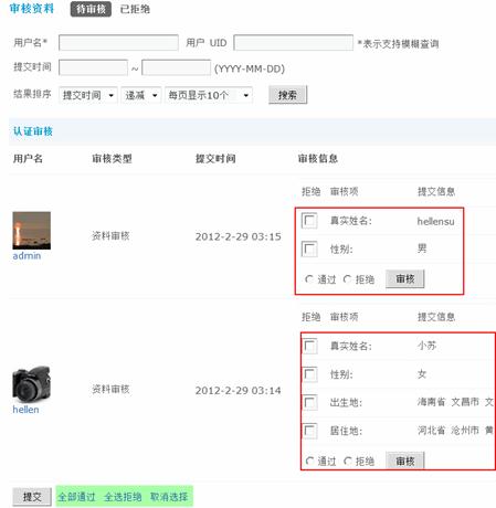 可以通过搜索用户名、用户UID、提交时间、结果排序搜索符合条件的会员信息进行审核。