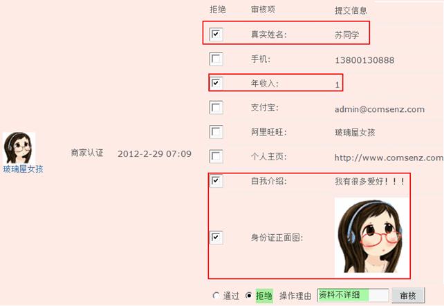 管理人员在待审核页面审核认证信息时,可以审核认证的每项信息,如果某些信息不符合认证需求,管理员可以勾选不符合条件的项目,进行拒绝操作。