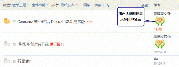 在版块的帖子列表页面,如果是认证用户发布的帖子,会在用户名称后显示认证图标,见下图