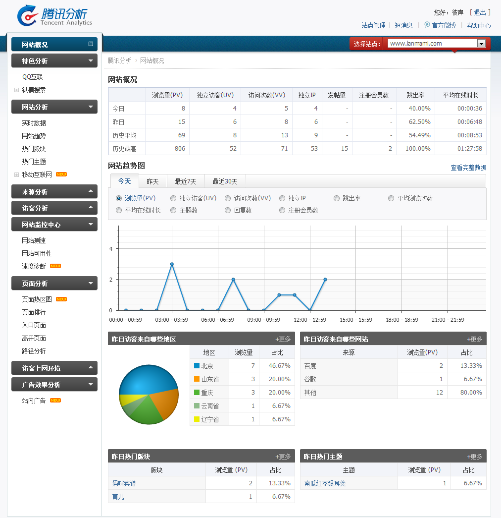 会员与游客:帮助站长区分游客与会员的比重,让站长清楚了解:浏览量(PV)、独立访客(UV)等各项指标趋势和规律