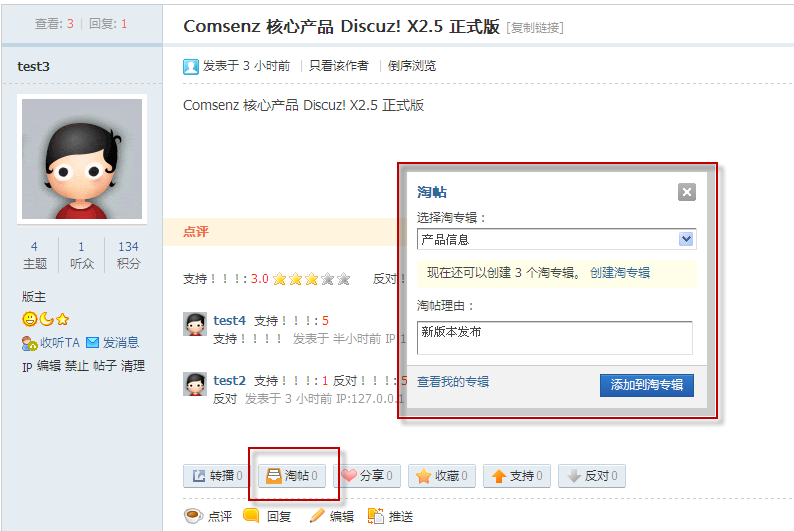 淘帖功能主要是方便会员对帖子进行分类收藏,将相近帖子制成专辑,扩展内容的深度,同时也能分享自己的淘专辑给更多论坛网友,实现了论坛帖子的收藏与分享价值。下面我们看下淘帖功能是如何使用的: