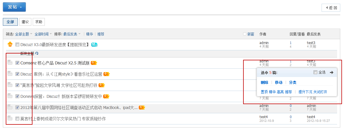 在主题列表页,可以对主题进行批量管理,选中要管理的主题,可以将其删除、移动、分类、置顶、精华、高亮、推荐、提升下沉、关闭打开