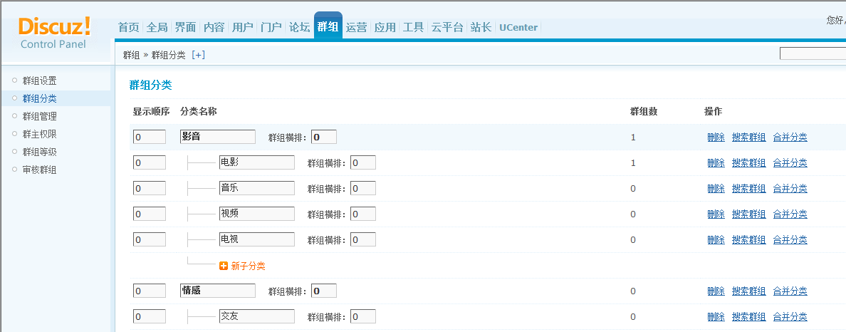 系统提供了影音、情感、生活、休闲、游戏、体育等分类,站长可以根据自己社区的运营情况,先设计好群组要开设哪些分类、等级,以及哪些用户组可以有权限创建群组等,在后台做好设置。如下图: