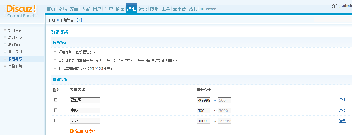 系统提供了普通级、中级、高级三个级别,站长可以充分发挥想象力,给群组等级起一些有吸引力的名字,在详情中指定各个等级拥有的权限。