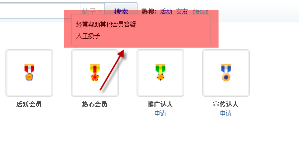 勋章用来彰显用户在某一方面的特殊贡献,提升用户的形象和知名度,调动用户积极性。根据各勋章的设置的不同领取方式,管理员可以给用户颁发勋章,用户也可以自已申请或者购买