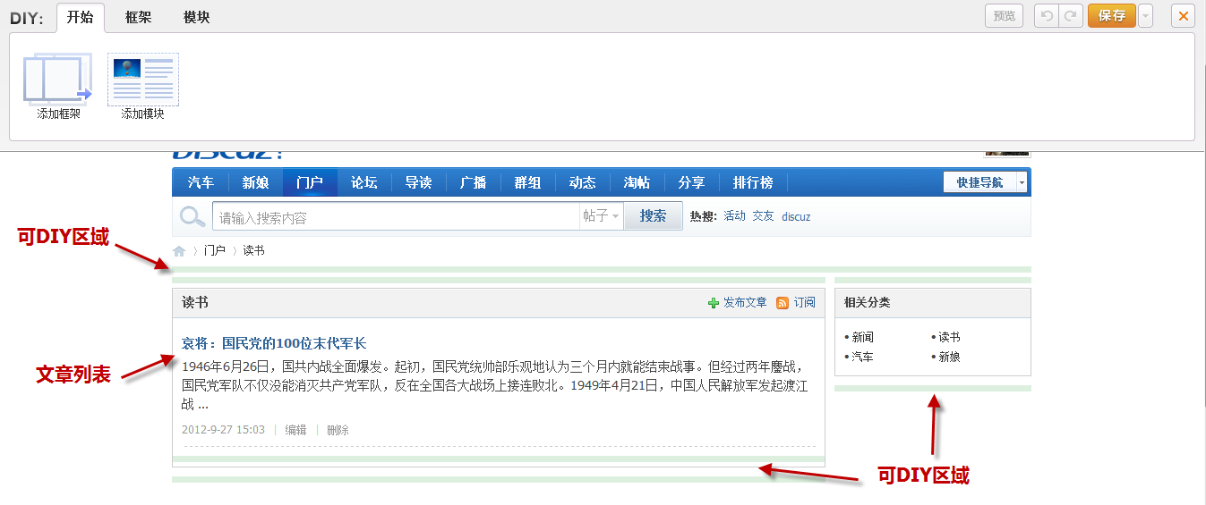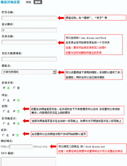 门户频道的主要功能是聚合社区精华,把精彩的内容聚合显示在一个页面上展示给用户看,从而吸引用户。 频道栏目,需要管理员在后台创建,点击后台 => 门户 => 频道栏目 => 添加频道: