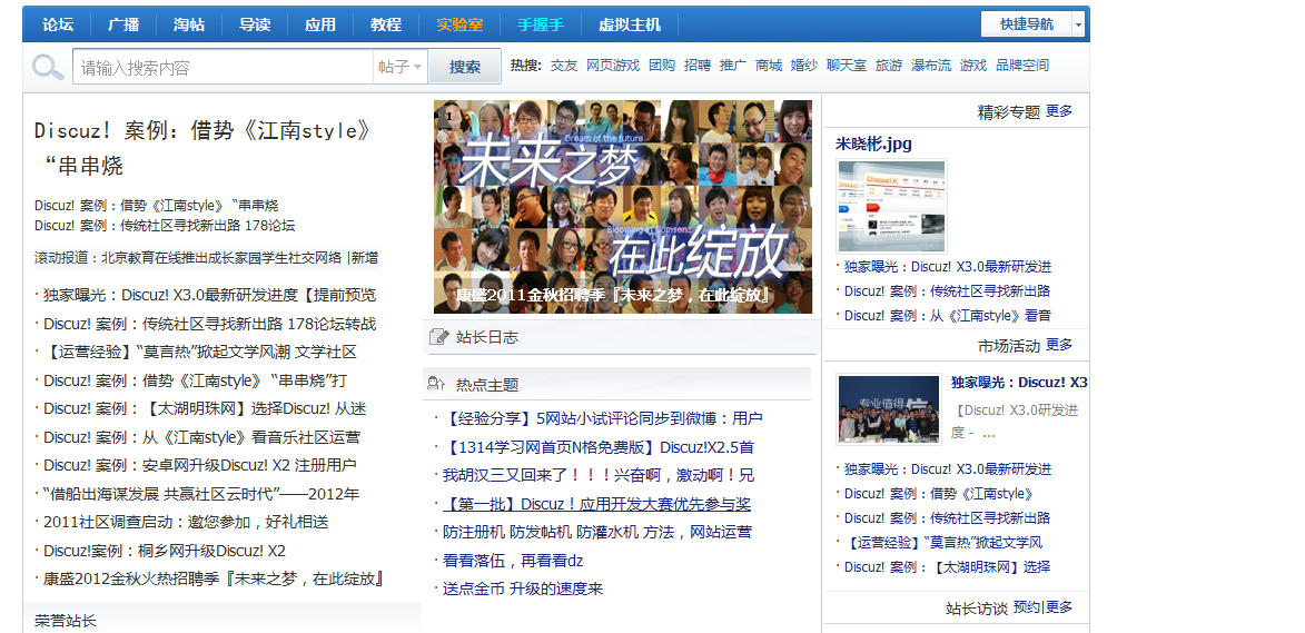 门户类似于cms,是最重要的核心功能之一。拥有频道栏目、专题、文章投稿、审核体系、编辑人员权限分配等基础功能;特有的可视化的页面拖拽技术,实现数据聚合;“推送”功能实现文章与帖子、日志有效互通。站长可以用“门户”制作一个简单的社区首页,也可以制作成类似于门户网站那样丰富的首页。