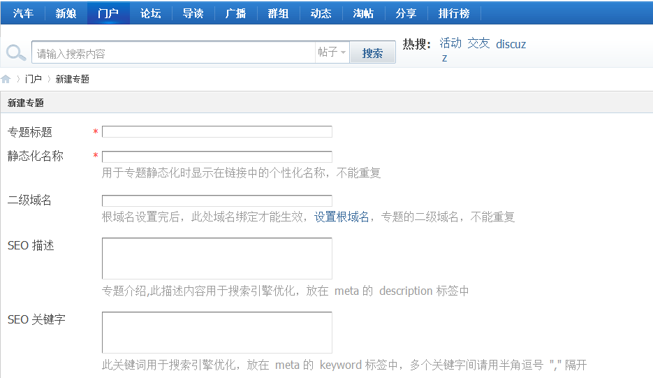专题创建需要在后台 门户->专题管理 下创建,点击创建专题,进入创建专题页面: