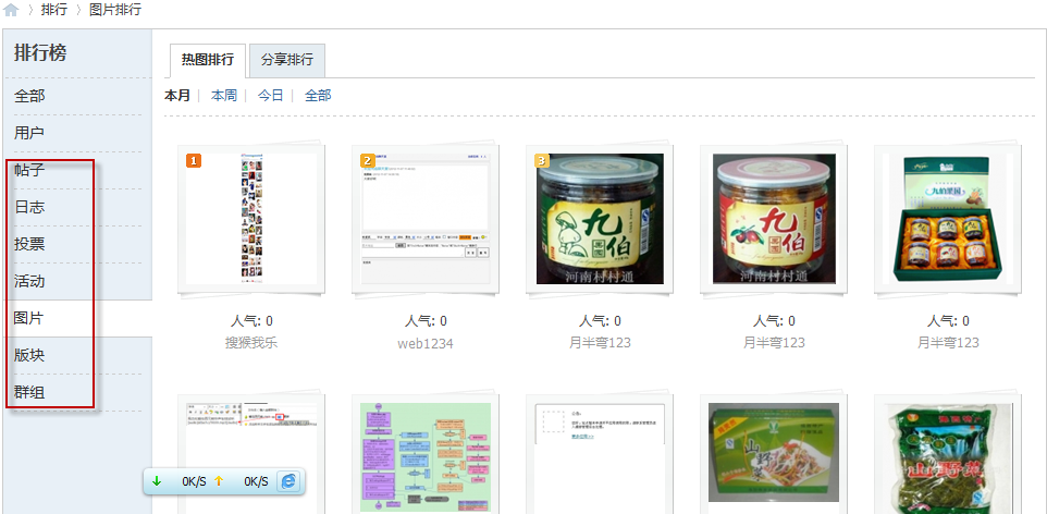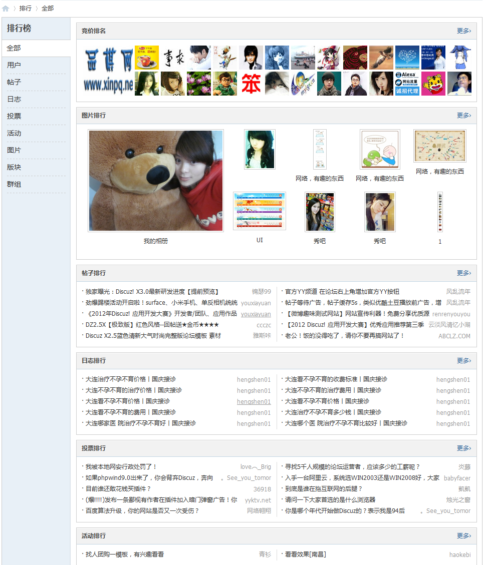 图片往往可以吸引人的眼球,站长可以在社区内多放一些图片,借图片排行来吸引会员眼球和点击;站长也可以鼓励会员多发图片,争取“上榜”机会,从而为社区增加人气。除了图片排行外,还有日志排行、群组排行、活动排行和版块排行,这些都能展示社区精华内容以及促进用户活跃度。