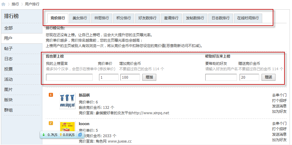 用户排行能够增强会员积极性,引导用户消费积分。在排行榜 => 用户排行列表中,分列竞价排行、美女排行、帅哥排行、积分排行、好友数排行、发帖数排行与日志数排行,能调动会员的积极性。站长可以引导会员获取积分、主动发帖,争取上榜,也可以鼓励会员消费积分加入竞价排名