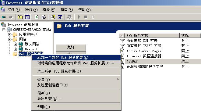 右键单击 “Web 服务扩展”,添加 PHP 扩展支持。