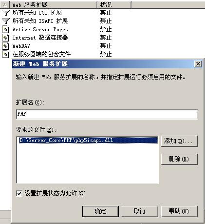 在如下图所示的“新建 WEB 服务扩展”对话框中,“扩展名”填写 PHP,“文件”选择 X:\Server_Core\PHP\php5isapi.dll,并设置该 PHP 扩展默认为允许。