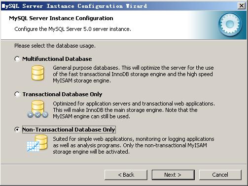 选择 MySQL 数据库默认存储方式:Non-Trans Only (MYISAM)
