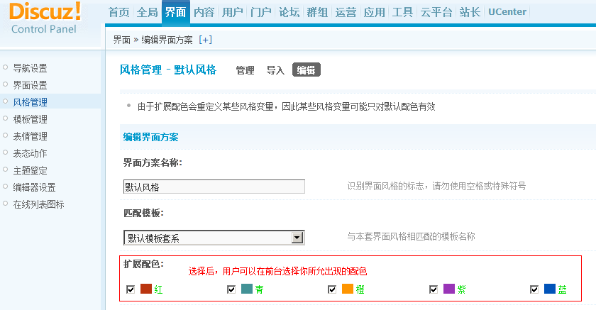 style.css 文件中头部的 [name]红[/name], [iconbgcolor]#BA350F[/iconbgcolor] 是用来配置后台中的配色方案名称和名称前对应的显示颜色值(采用16位制配色),扩展时需要手动配置所扩展的配色方案的对应名称和显示颜色。注释:此配色的样式加载是在 header.htm 中根据默认或者用户的上一次设置对应加载的。