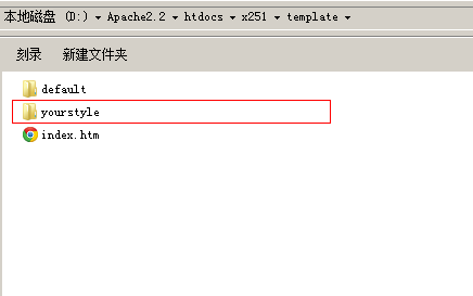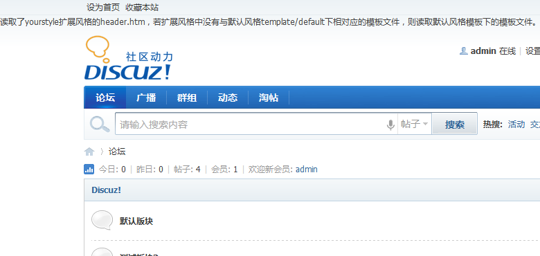 将扩展风格 yourstyle 设置为当前模板套系, 由于这个目录下现在还没有文件, 则默认调用默认模板 template/default/ 文件夹下的文件, 这样一个完全和默认风格相同的扩展风格就建立完了。如下图: