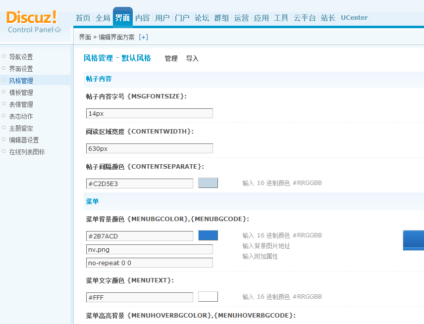 首先在 template/ 文件夹下新建一个 yourstyle 文件夹放置模板风格文件, 然后复制 default 下的 discuz_style_default.xml, 重命名为 discuz_style_ 你的风格名称.xml(注意这里 discuz_style_ 是必须保留的)。这个文件配置的是下图中后台风格管理中配置的变量内容。