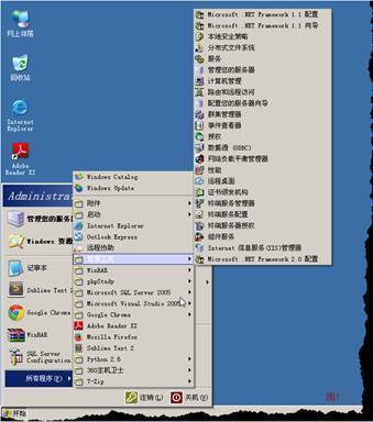 在开始菜单->所有程序->管理工具中,选择 Internet 信息服务(IIS)管理器(图1),打开 Internet 信息服务(IIS)管理器,界面如图2.